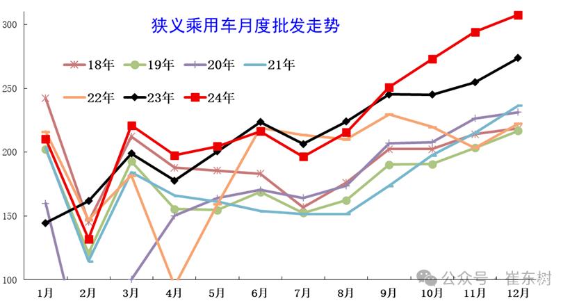 进入到金九银十之后,国家置换政策的强势助攻,让四季度车市的收官战打得非常漂亮,包括历年也很少这样的超强上升走势。使得12月狭义乘用车的批发销量突破300万辆,实现了创历史新高的强劲表现。