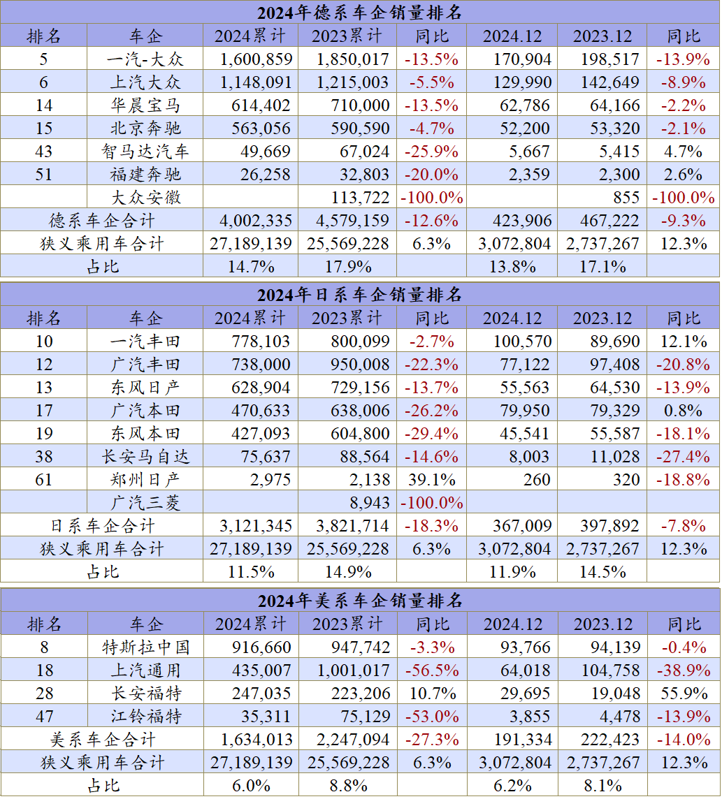 最后是美系品牌,最大的销量贡献者从上汽通用变成了特斯拉,全年销量从2023年的224万掉到了163万辆,下滑幅度达到了27.3%,市场份额也从2023年的8.8%下降到了6%。