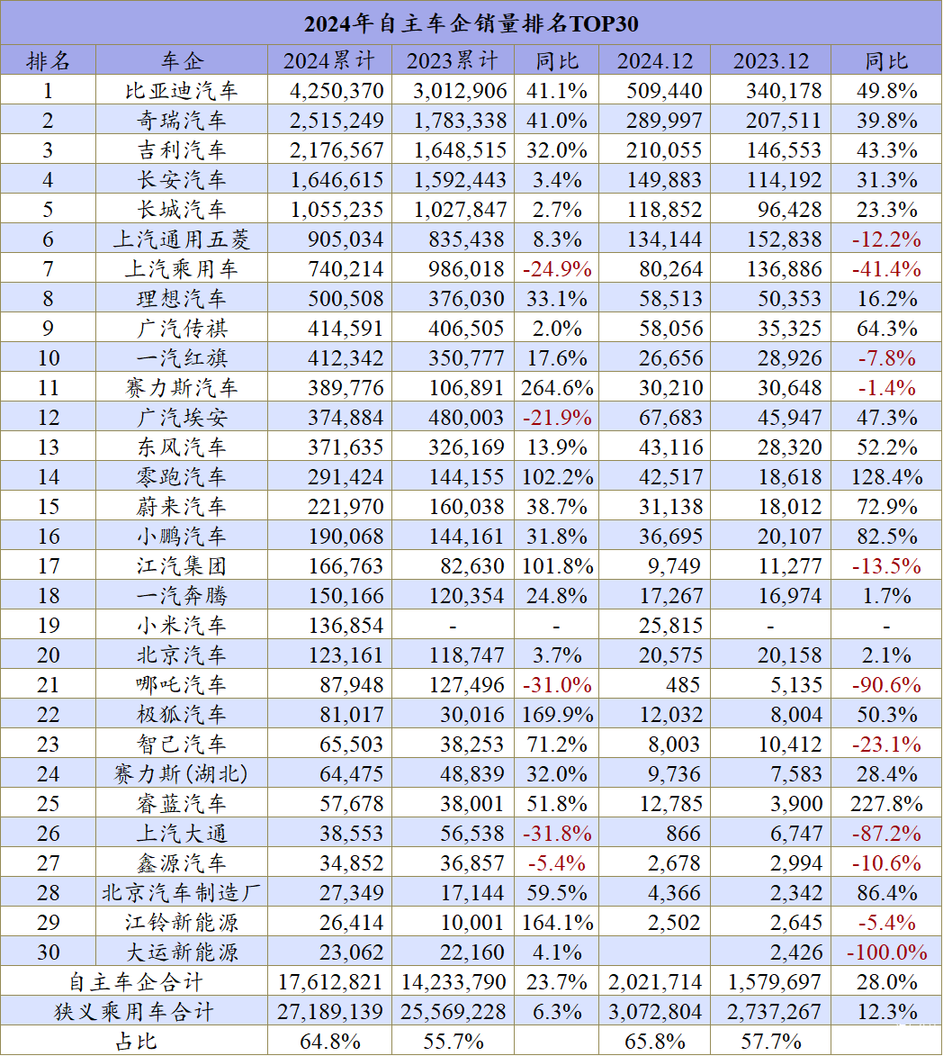 2024年全年,自主车企的总销量达到了1761万辆,同比增幅达到23.7%,这和市场大盘6.3%的增幅对比,高下立见,且实现了338万台的增量。