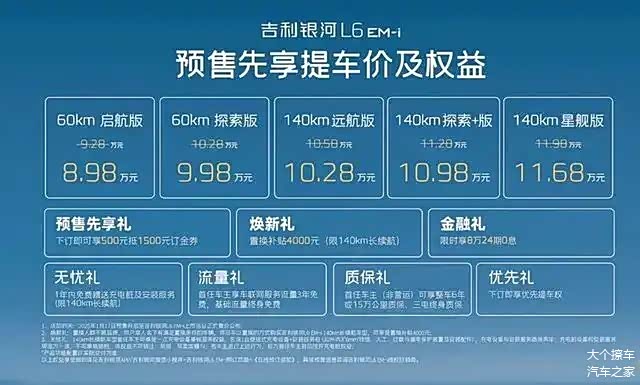吉利银河L6 EM-i在预售阶段提供了五种不同配置的车型,包括60km的启航版、60km的探索版、140km的远航版、140km的探索+版以及140km的星舰版,这些车型的预售价格范围是8.98至11.68万元。