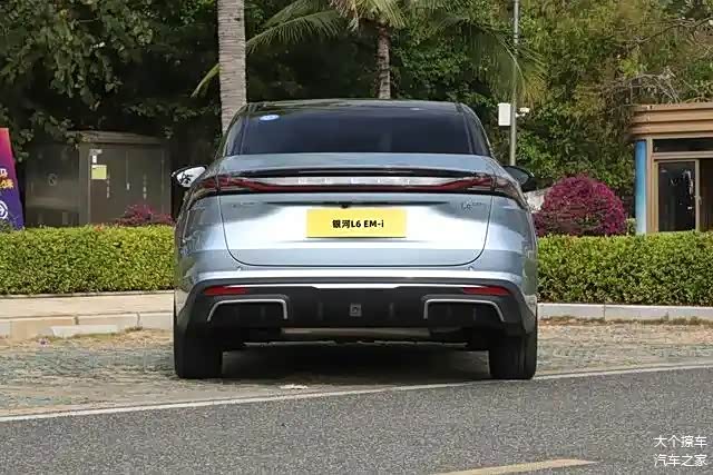 在车辆的尾部设计中,吉利银河L6 EM-i的尾部也采用了一种贯穿式的尾灯组合,并且尾灯的中央区域还特意添加了熏黑装饰元素。此外,尾部的后包围底部融入了大量的熏黑装饰元素和扩散器装置,与U型装饰元素相结合,赋予了尾部一种独特的运动感。