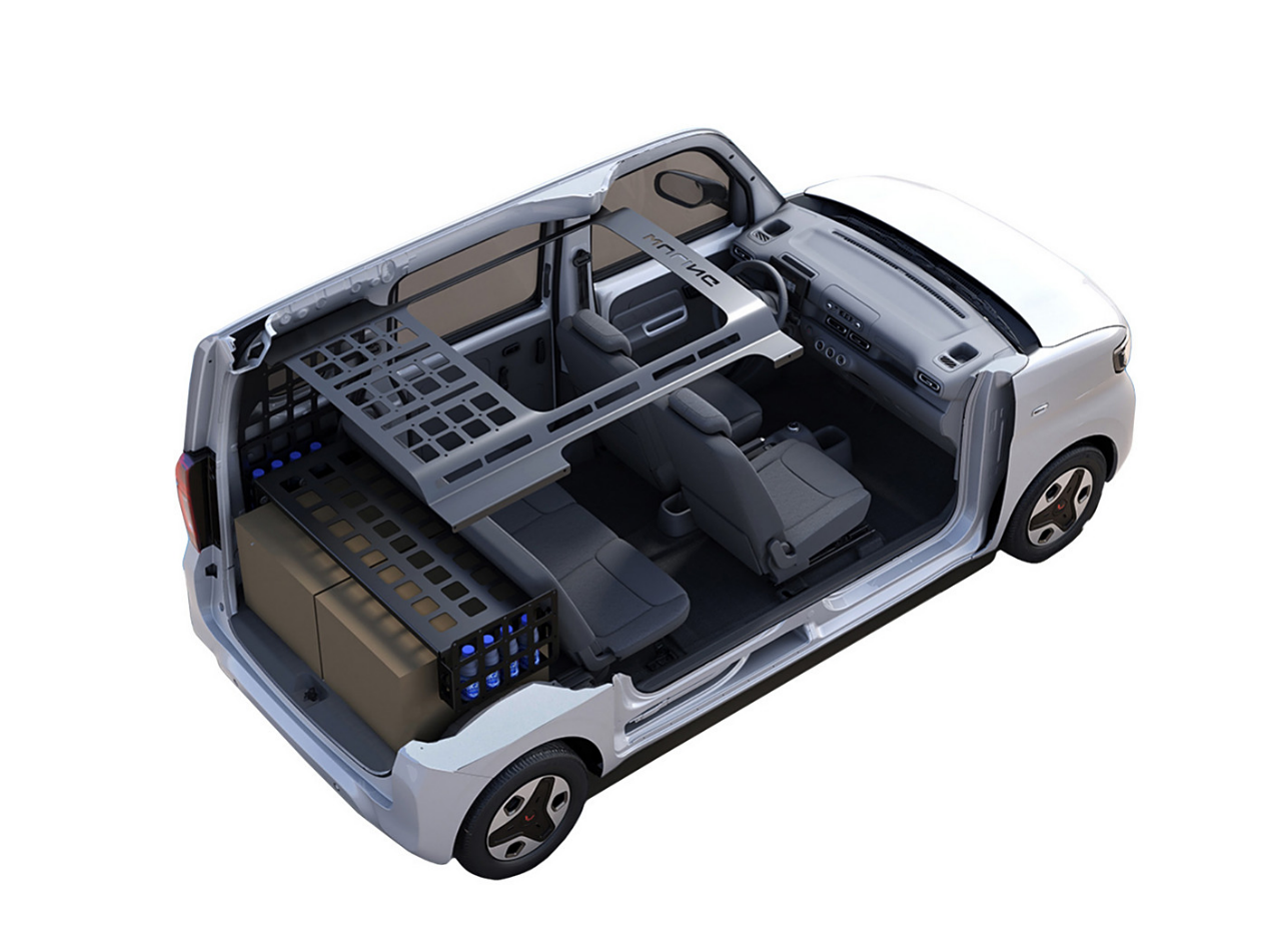 内饰的设计风格延续了宏光MINI EV上的圆形元素的设计风格,虽然不及一般家用车大屏+软包的舒适体验,但这套简洁的内饰也让人对面包车的“简陋”印象有所改观。座椅采用了织物材质,同时,后排座椅可以整体放倒。前排配有两个USB充电口。