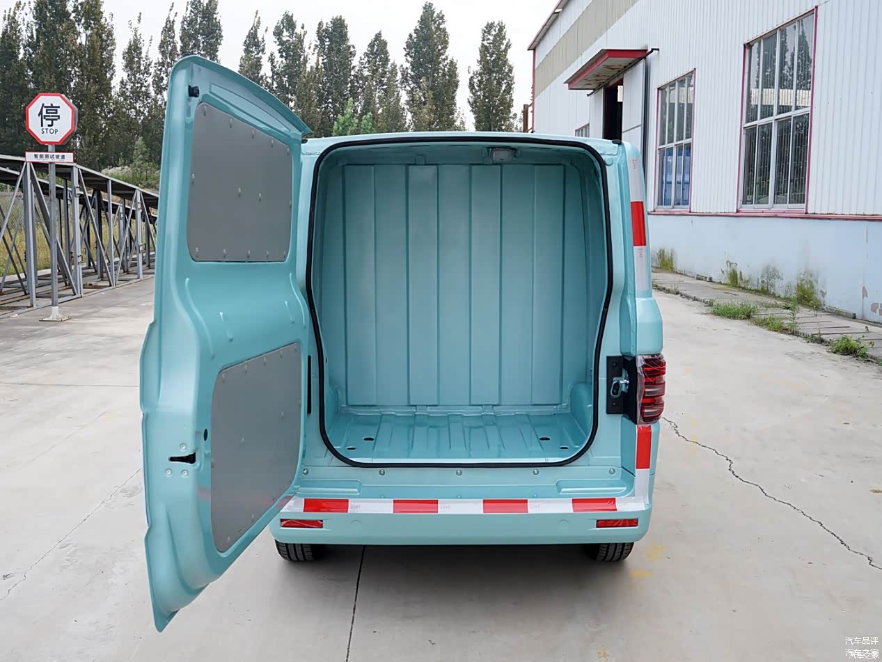 车尾同样是可爱的拼色设计,同时它所采用的侧开式尾门设计,在使用中比上开门开口更大,更方便我们拿取货物。与五菱不同的是,橙仕01的尾门并未配备车窗,这也是其货运用途的体现。