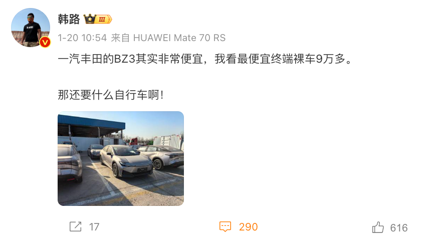 近日,著名头部汽车媒体人公布了关于一汽 丰田BZ3(图片 | 参数 | 询价)价格下探至9万区间的消息,看似不可思议,但也能够理解。