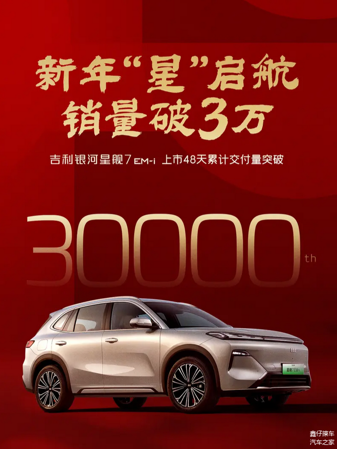 1月23日,我们从吉利银河官方获悉,吉利 银河星舰7(图片 | 参数 | 询价)EM-i上市48天,累计交付量超过3万台。新车于12月6日上市,共推出5款车型,在2025年1月31日前大定锁单的用户,可享受限时先享指导价9.98-13.28万元。