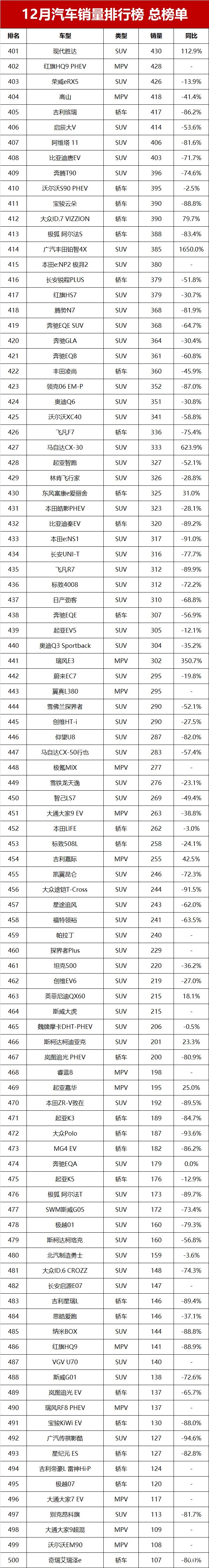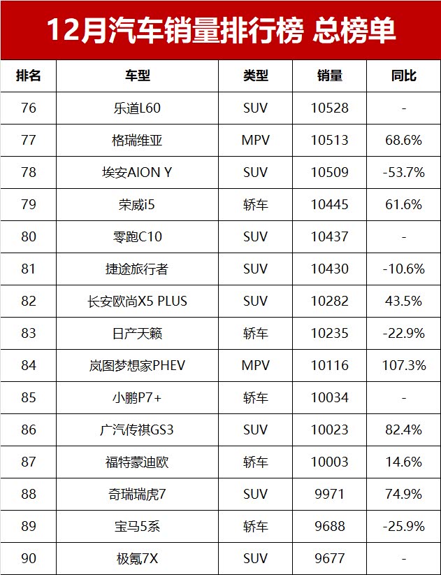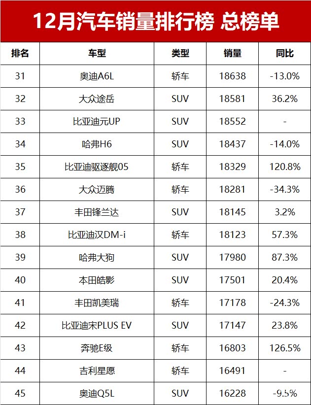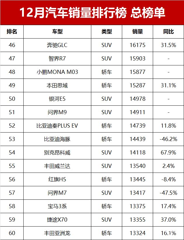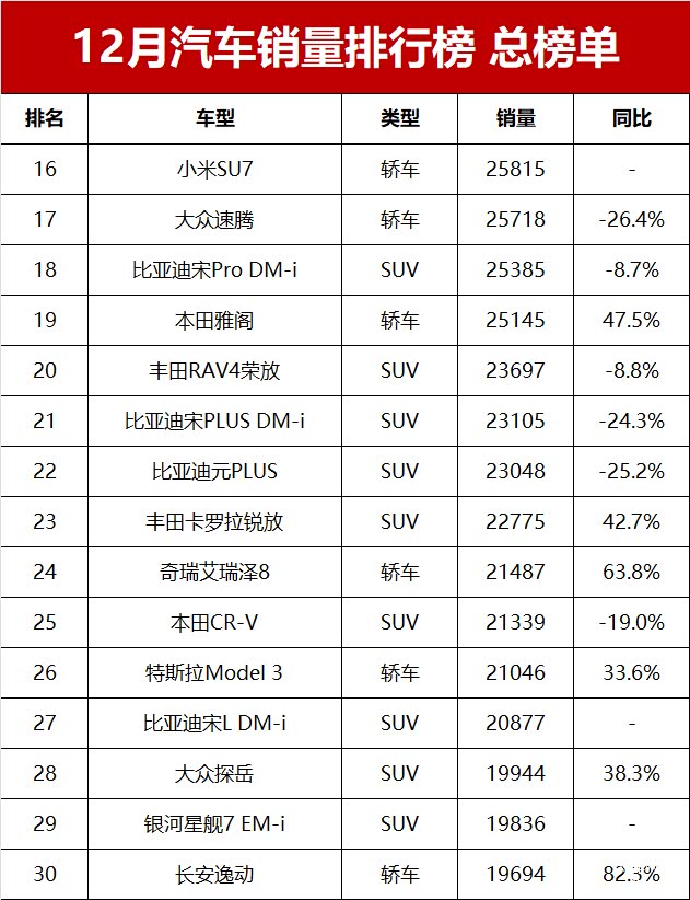 小米SU7销量再创新高,12月份以25815辆的销量排名第16位。本田雅阁同样创下换代以后的最高月度销量成绩,以25145辆的销量排名第19位。