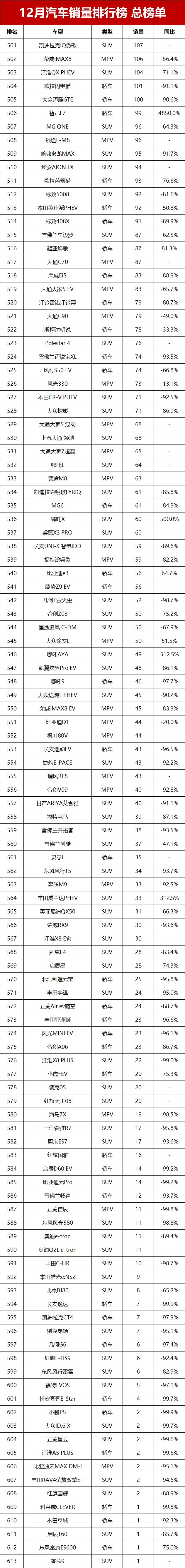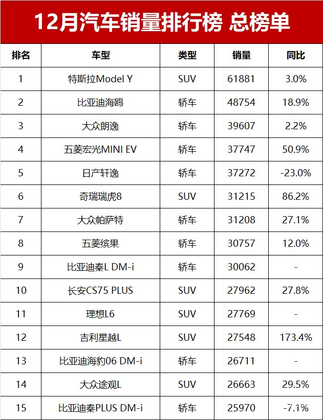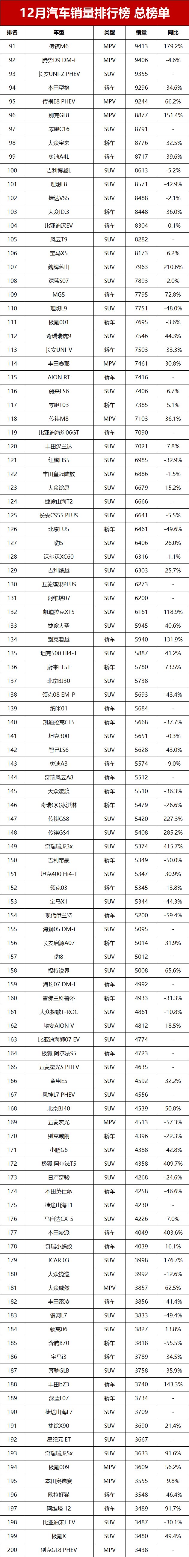 大众朗逸、五菱宏光MINI EV、日产轩逸、奇瑞瑞虎8、大众帕萨特、五菱缤果、比亚迪秦L DM-i等七款车销量均超过3万辆,排名第三至第九位。其中,朗逸是12月燃油车销量冠军,瑞虎8是燃油SUV销量冠军,帕萨特是中型车销量冠军。