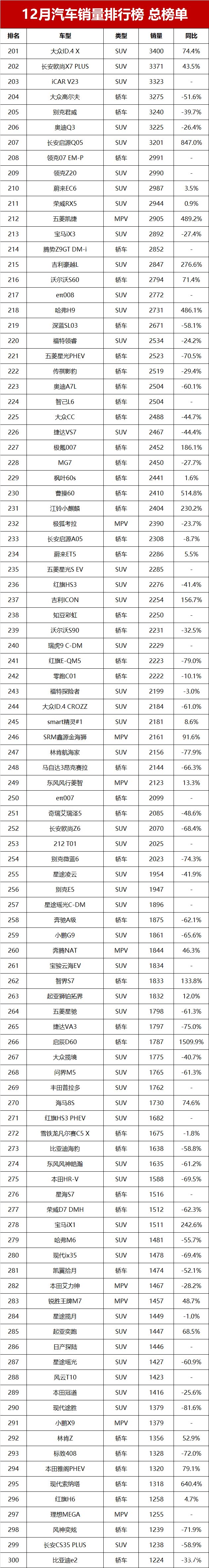 【2024年12月汽车销量排行榜 总榜单】12月份国内乘用车市场销售火爆,销量再创新高。乘联会数据显示,2024年12月国内狭义乘用车市场零售销量达到263.4万辆,同比增长12.0%。其中,轿车零售销量115.3万辆,同比增长4.1%;MPV零售销量13.5万辆,同比增长34.7%;SUV市场销量134.6万辆,同比增长17.6%。那么,12月份你喜欢的车的销量能排第几位呢?小编带大家一起去看看。