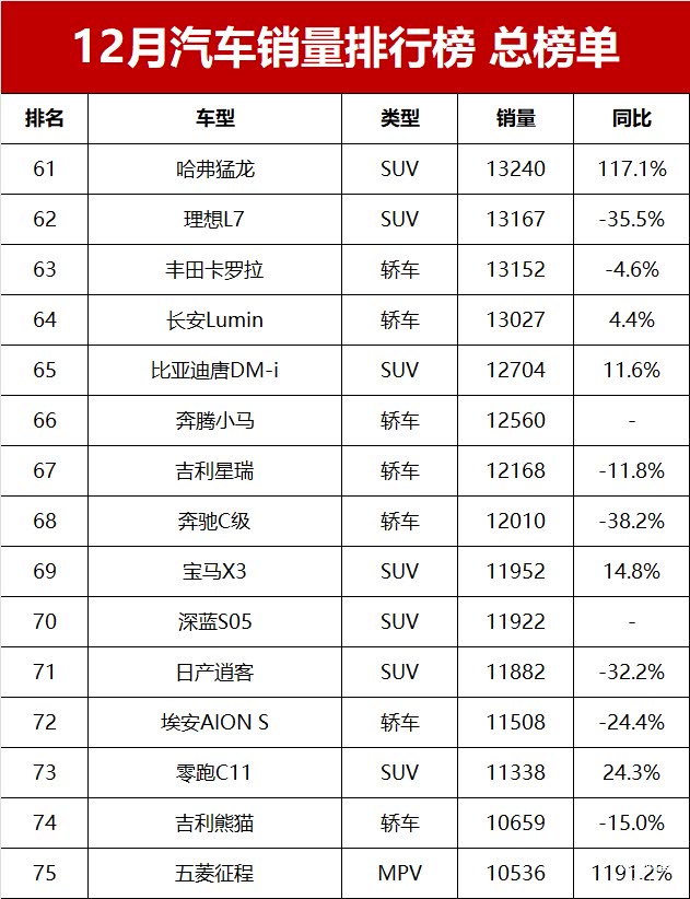 曾经的全球轿车销量之王丰田卡罗拉如今销量已大不如前,12月销量为13152辆,排名第63位。