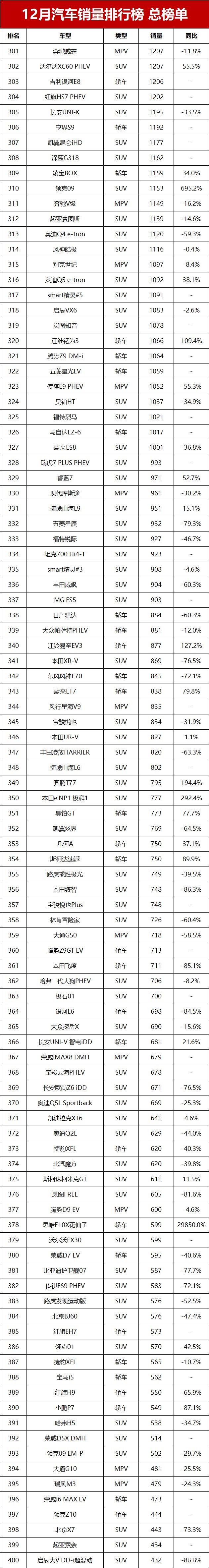 对于2024年12月其他乘用车的零售销量及其排名情况,详见下表: