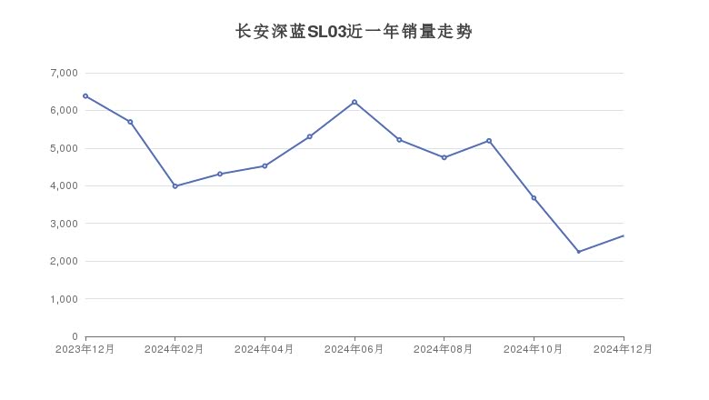 长安深蓝 SL03 在 12 月销量 2671 辆,位列第 6 名,同比下降 58.15%,环比增长 19.03%,相比 11 月增加 427 辆。该车售价区间为 14.59 - 21.79 万元。