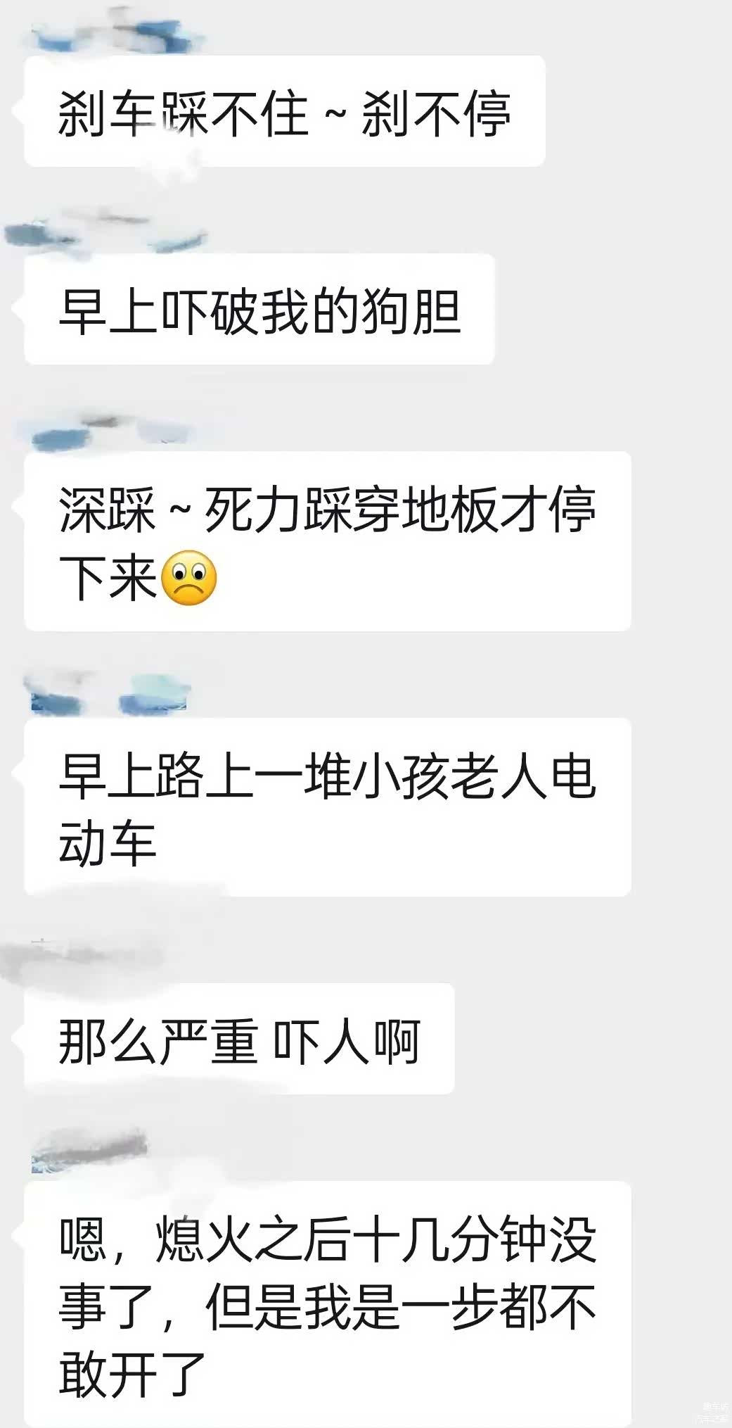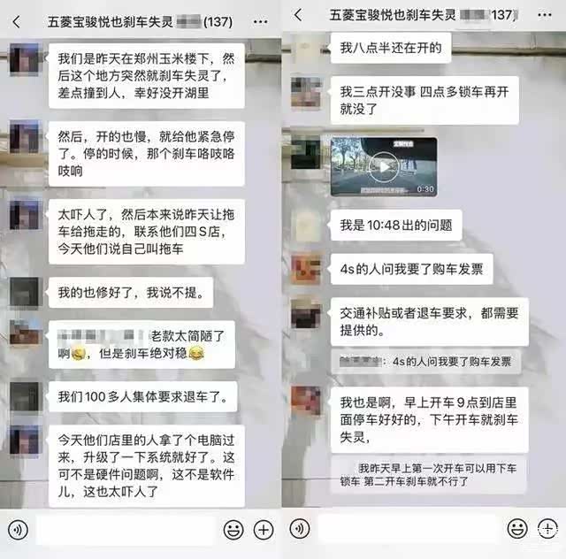 还有车主在网络上发布了维权群的聊天记录,根据图片信息,有车主的宝骏悦也突然刹车失灵差点撞到人,“幸好没开到湖里”;有车主则并没有不幸中的万幸:“连踩刹车毫无反应,改为R档(倒车挡)也没有反应,马上拉手刹,撞上了行使的摩托车和宝马,弹回来又撞了一下宝马,最后车子踩停下来。”
