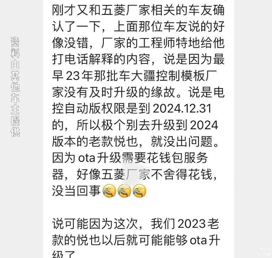 有车主向相关媒体提供了自己获得的4S店对此次问题的解释,“说是因为最早23年那批车大疆控制模版厂家没有及时升级的缘故。说是电控自动版权限时到2024.12.31的,所以极个别去升级到2024版本的老款悦也,就没出问题。因为OTA升级需要花钱包服务器……”