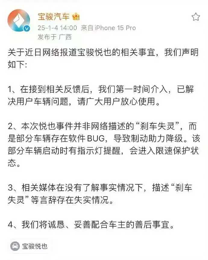 宝骏称:“本次悦也事件并非网络描述的‘刹车失灵’,而是部分车辆存在软件BUG,导致制动助力降级。该部分车辆启动时有指示灯提醒,会进入限速保护状态。”宝骏还指责部分相关媒体“在没有了解事实情况下,描述‘刹车失灵’等言辞存在失实情况。”
