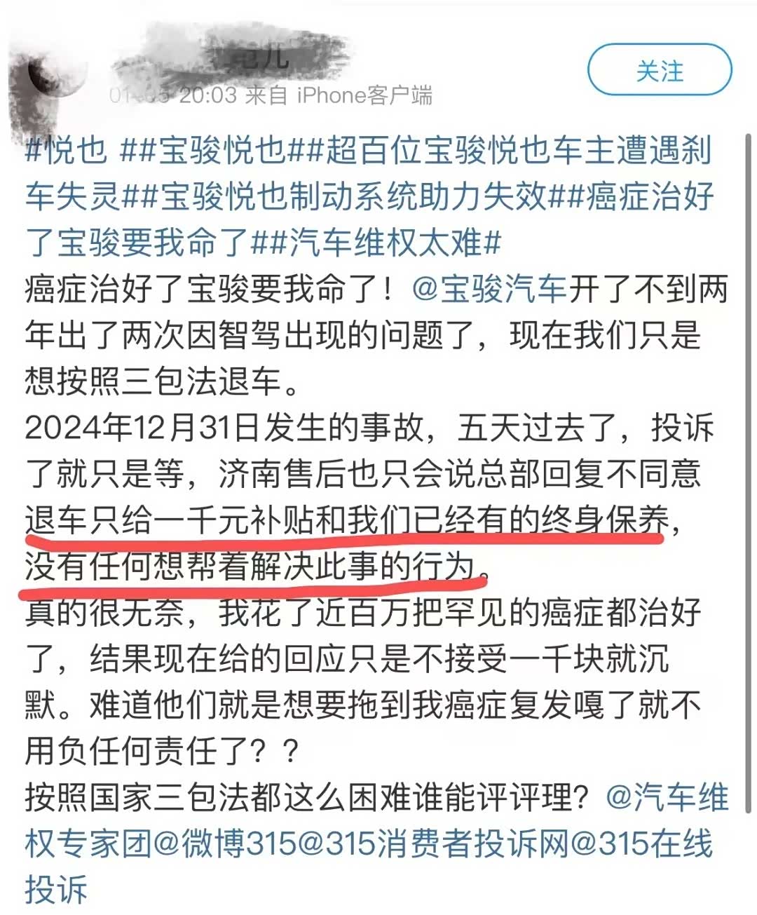 车辆问题如此严重,终身质保难道不是应该的嘛?1000元的礼包又是怎么回事?难道车主的生命只值1000元?种种不满,在宝骏近乎“羞辱”的1000元礼包的激化下,变为了怒火。