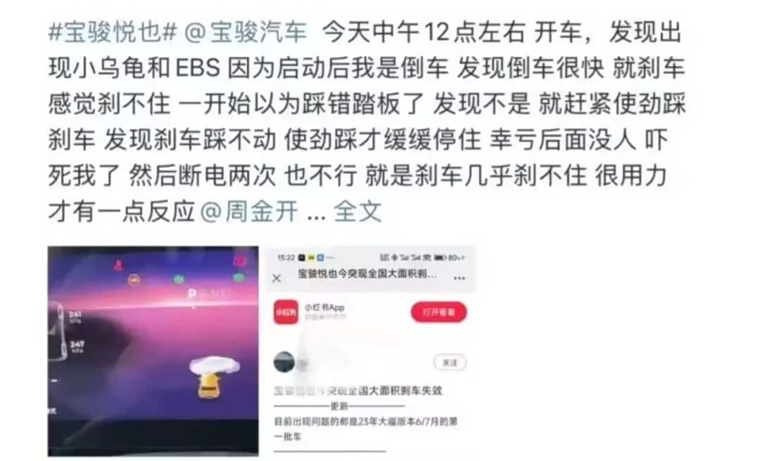 还有车主称,自己的宝骏悦也“倒车很快,就刹车感觉刹不住,一开始以为踩错踏板了,发现不是就赶紧使劲踩刹车,发现刹车踩不懂,使劲踩才缓缓停住……就是刹车几乎刹不住……”