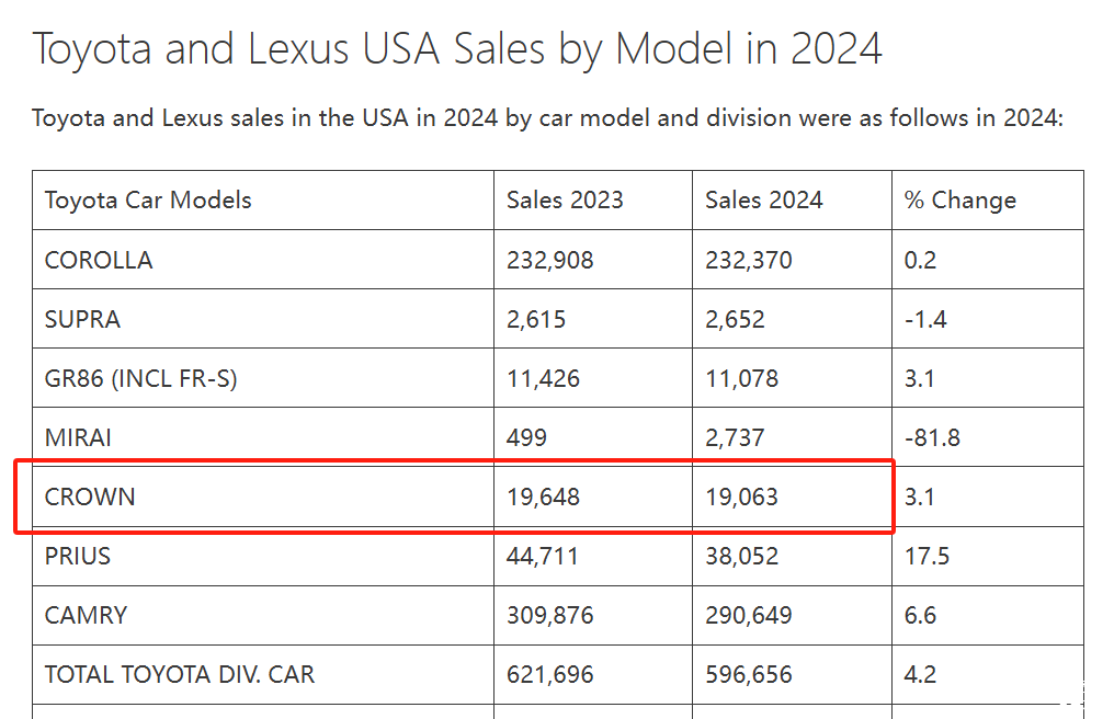 在美国市场销售的Crossover版(美国本土称Crown)在2024年全年也有近20000辆左右的销量。