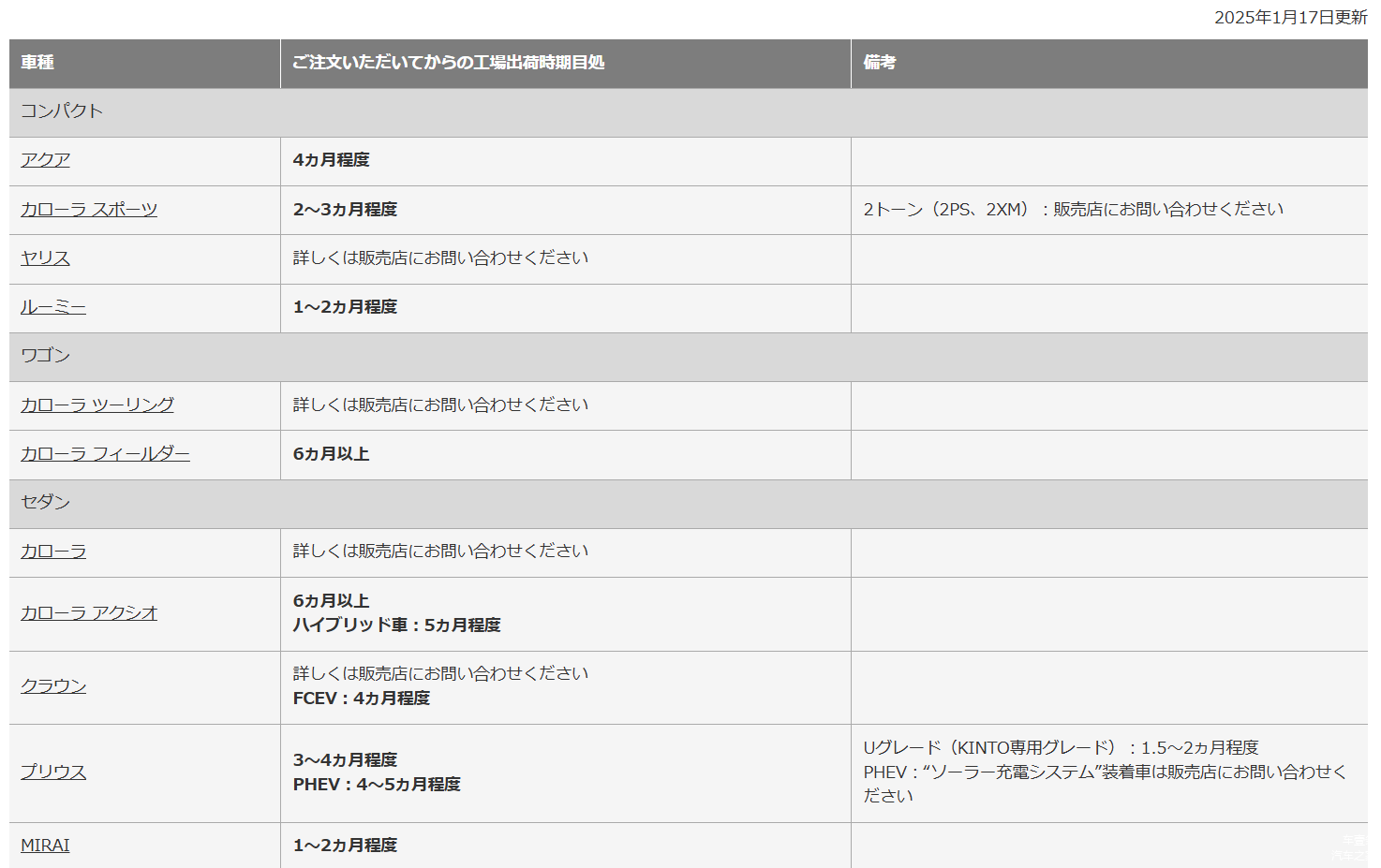 日本丰田官网公布的信息显示,不少车型都需要等待2个月至4个月才能提车,部分车型直接停止接单。