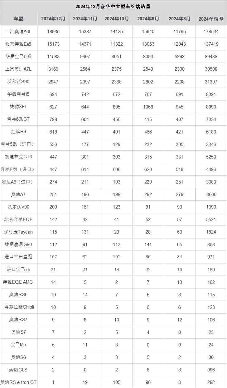 在2024年12月,一汽奥迪A6L延续了之前的不错势头,月终端销量18935辆,全年总销量178534辆,成为豪华中大型轿车市场的销量关键;市场认可度原本不低再加上大幅度让利促销,奥迪A6L的销量始终保持在较高水准。上汽奥迪A7L的12月终端销量为3169辆,又一次在月度销量上超越沃尔沃S90,其全年销量为30508辆,是一个可以让人满意的成绩。进口A6、A7的2024年终端销量分别为3383辆、3666辆,前者是因为旅行车市场份额有限,后者则是因为被国产A7L分走了销量。高端车型方面,S6、S7、RS6、RS7的2024年总销量分别为30辆、23辆、115辆和106辆;在高端市场,奥迪品牌认可度还需要提升。