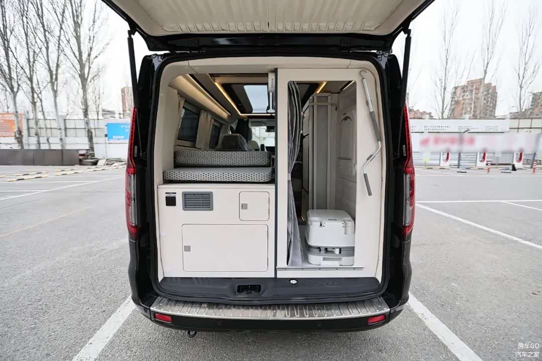 打开尾门,是一组可以拓展的床位,在下方预留了用电口,以及一大一小两个储物空间。小舱门打开以后,内部的深度是非常充足的;在右侧就是卫生间了。