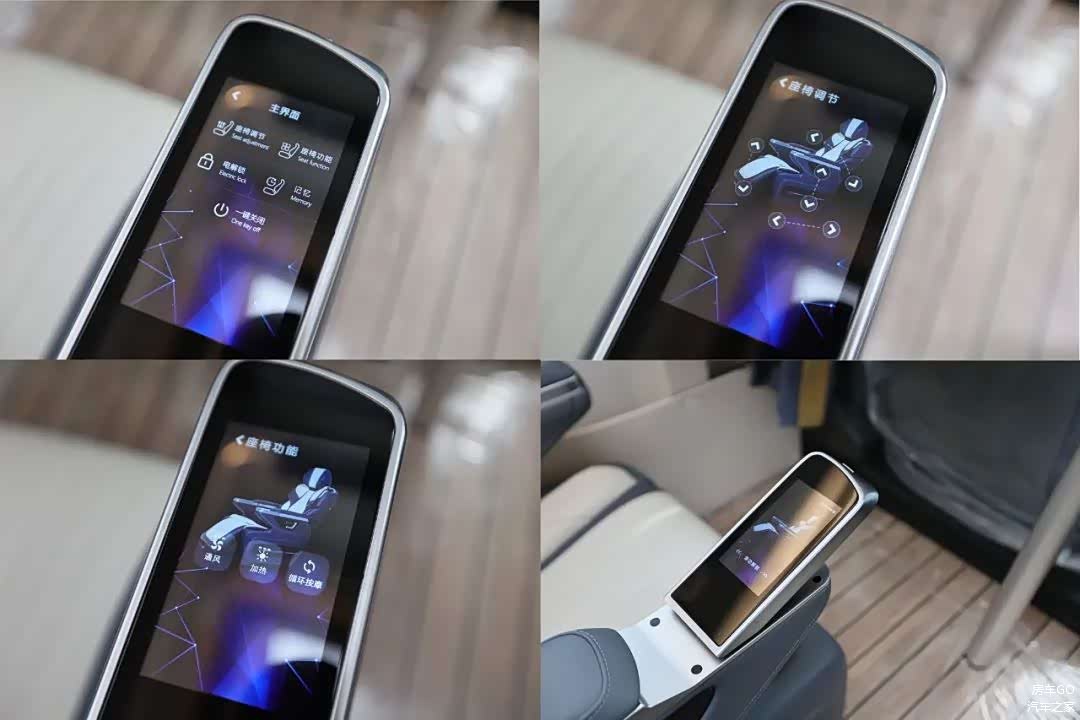 右侧扶手隐藏了触控的面板,包括座椅加热、通风和按摩,包括电动的腿托还有座椅记忆和一键躺平。头枕除了高度可调,角度也多级可调。座椅侧面也预留了更快捷的实体按键。