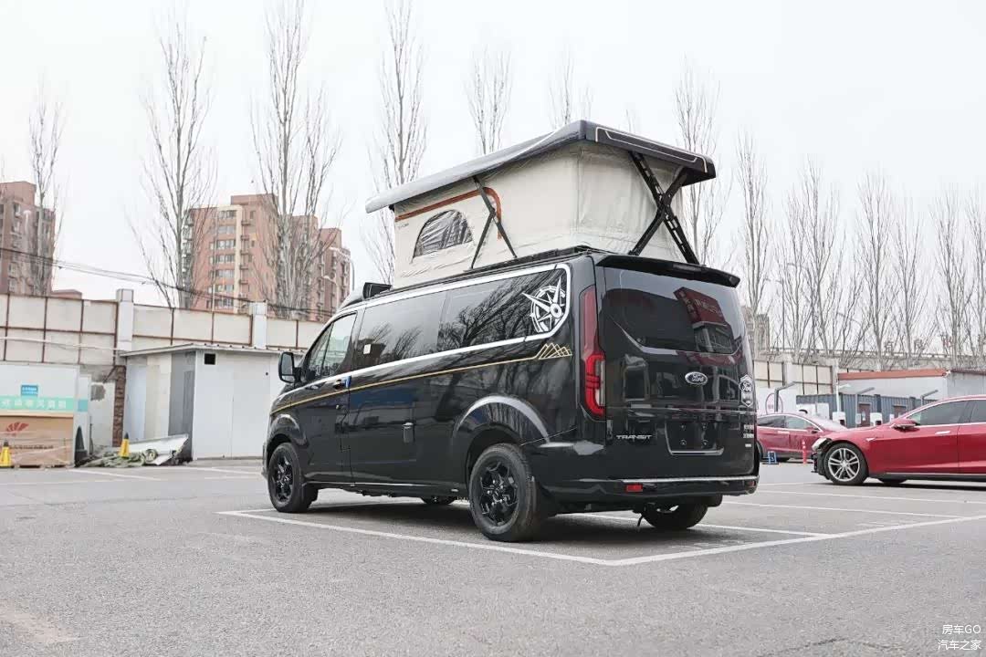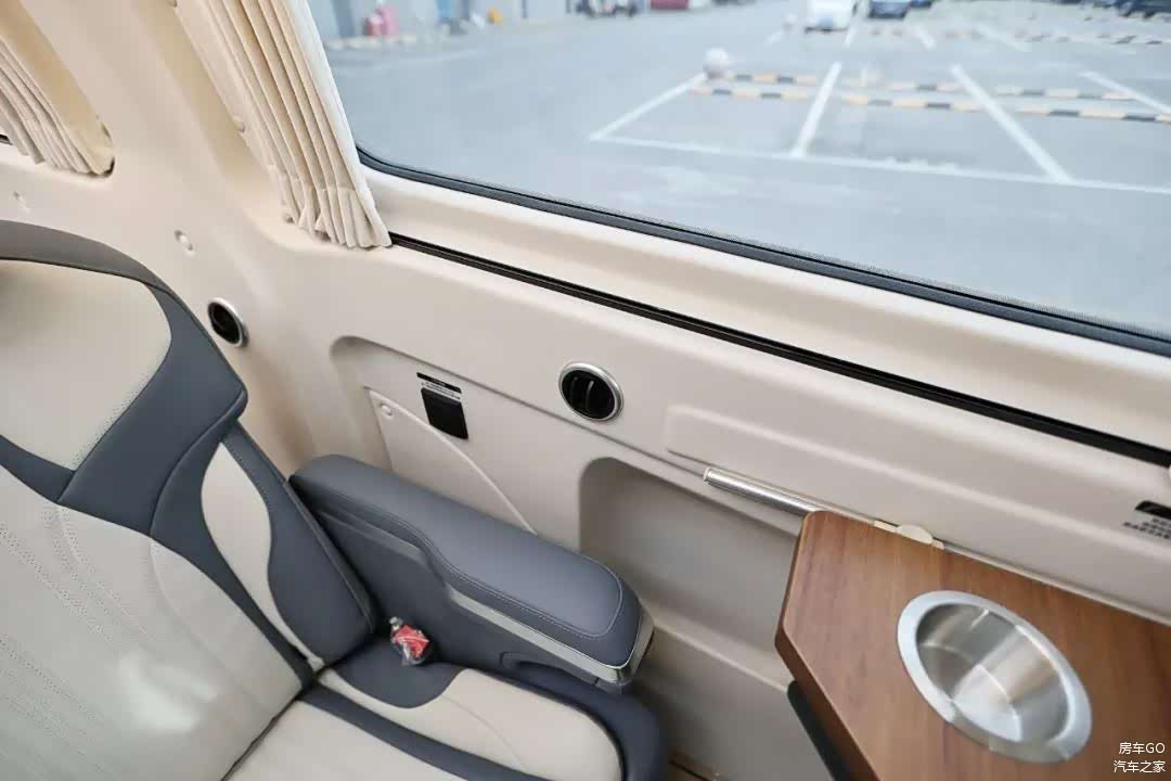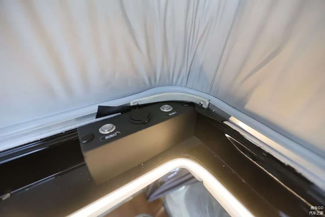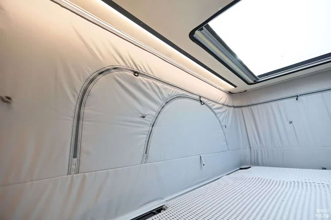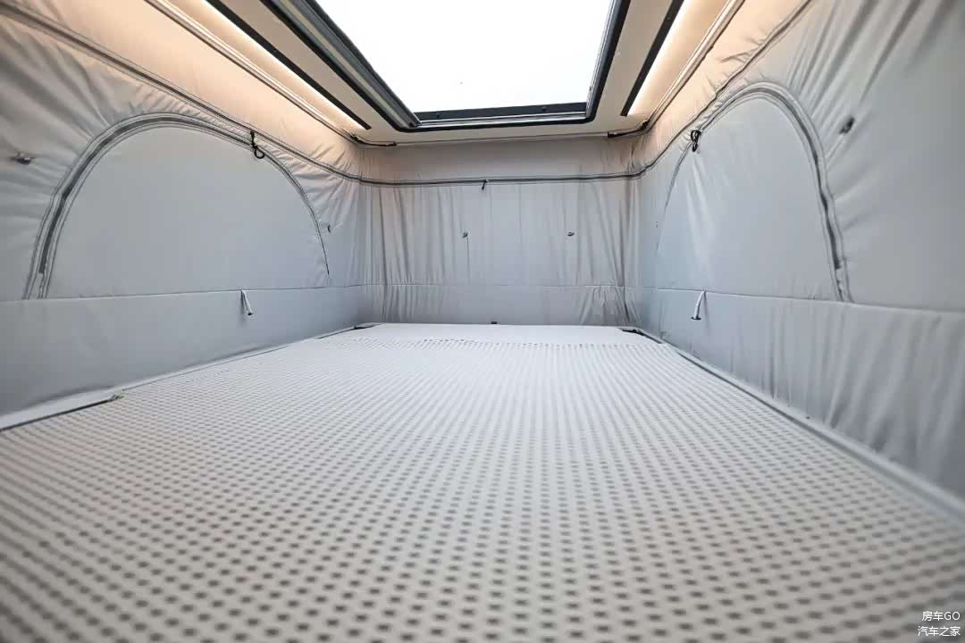 车内不升顶时的平均内高实测是1.46米,正常乘坐实测1.9米的身高头部空间绰绰有余。在升顶机构完全打开以后,可以把屋顶也是二层的床板推起来,获得更大的头部空间。