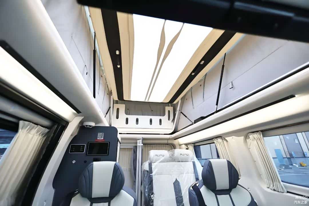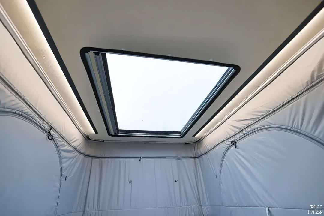 车顶的超大天窗不仅可以加强采光,也减少了传统升顶房车的压抑感,晚上可以透过它躺在床上看星空。