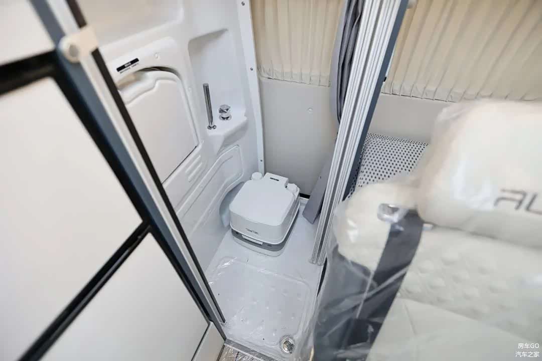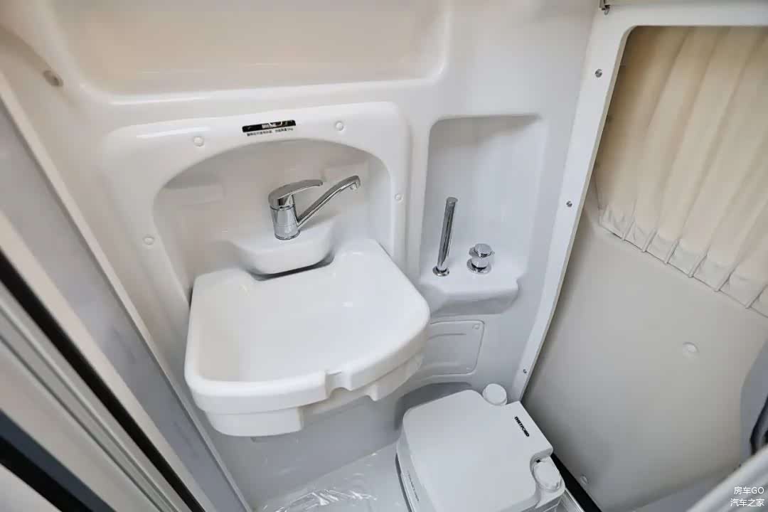 车尾采用开放式的卫生间,配备了便携式的坐便器,洗澡的时候可以移出。洗手台盆也是可以收纳的设计更加节省空间,侧面配备了独立的花洒。