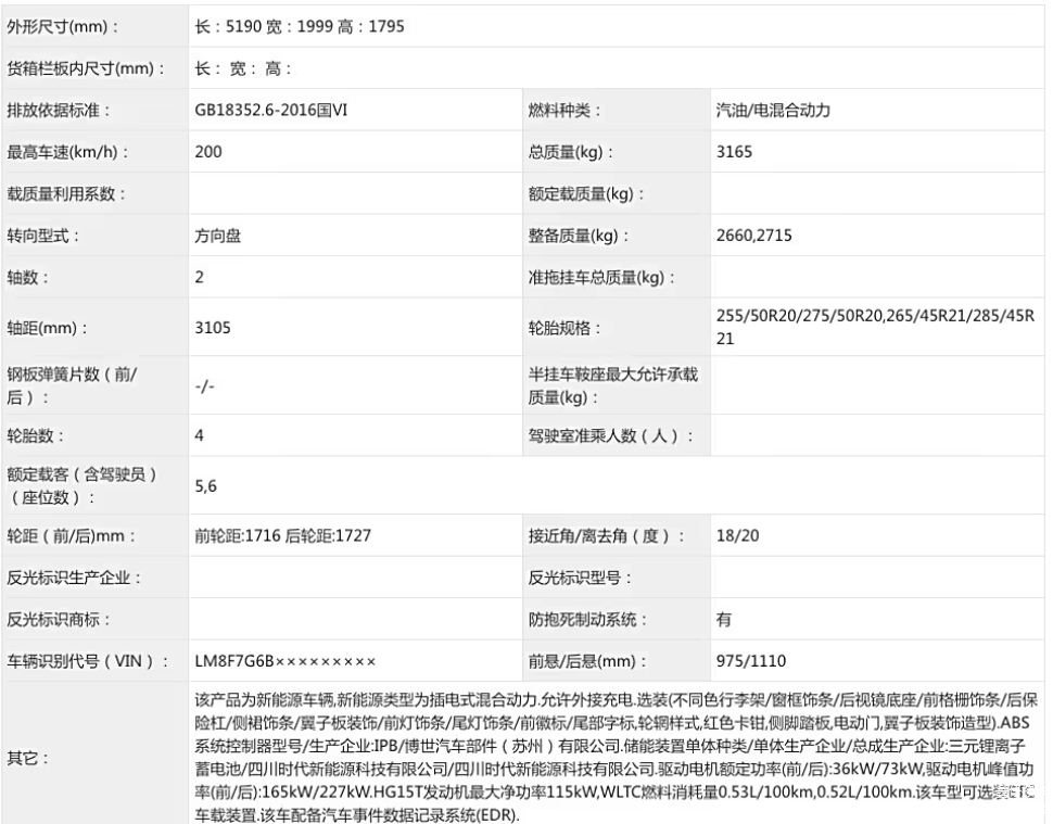 车身尺寸:5190×1999×1795mm,轴距3105mm;轮胎规格:255/50R20、275/50R20、265/45R21、285/45R21。
