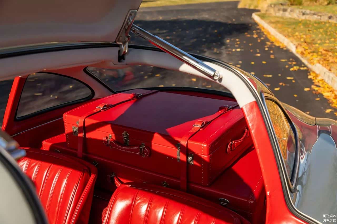 内饰方面看起来十分优雅时尚,座椅、仪表板和侧窗台都使用了鲜红色真皮,看起来状况完好无损,甚至前排座椅后面原装的大手提箱上也使用了相同的真皮。