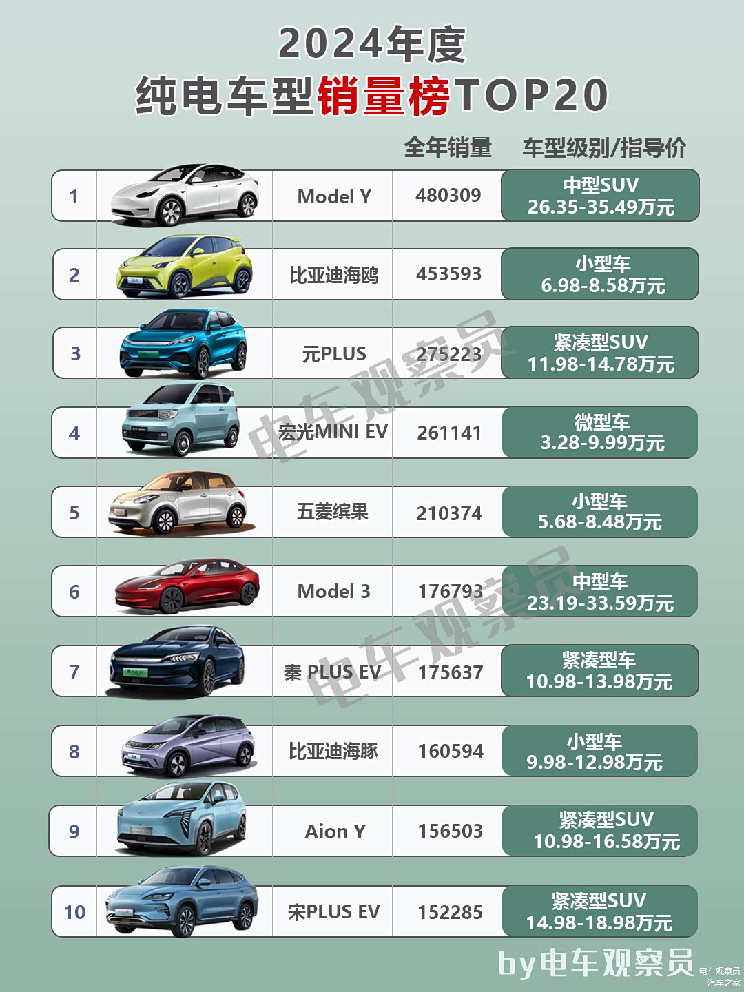 2024年度新能源车销量已在上期更新,许多朋友表示希望把纯电车型单独列出,销量是消费者们用真金白银的投票,是最有力的参考,今天就一起来关注年度热销纯电车型TOP20