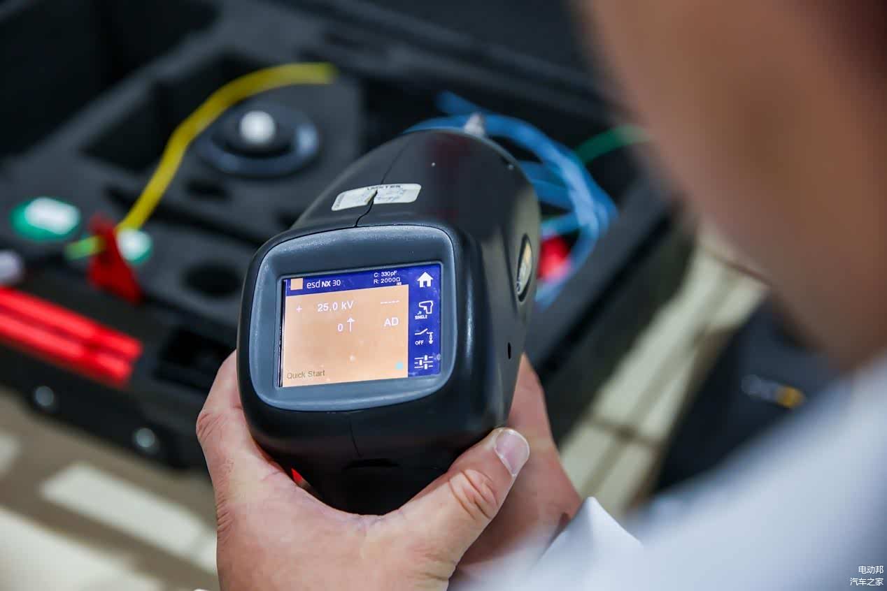 在静电放电测试中,别克GL8 PHEV坚持对车内外所有乘客能碰触到的地方进行测试,使用校准过的静电枪从低电压等级逐级增加进行静电放电测试,根据不同的位置不同的放电情况最高会达到25kV,确保顾客的车辆不会在秋冬季静电的发生,从而出现不必要的静电损坏。