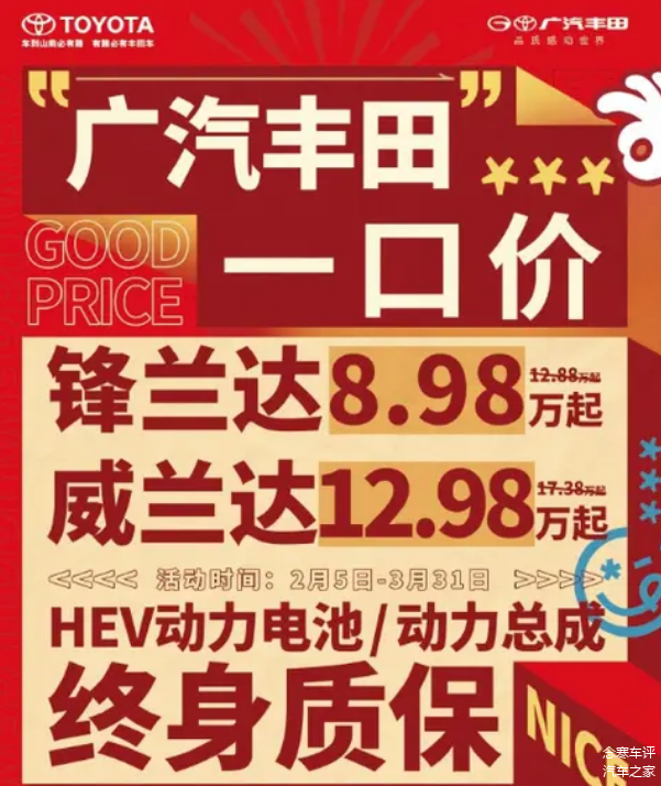 近日,广汽丰田开年即放大招,宣布“一口价”官降政策, 威兰达(图片 | 参数 | 询价)全系12.98万元起,锋兰达全系8.98万元起,最高直降4.4万元!
