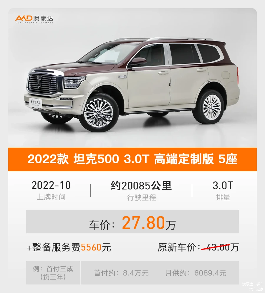 市面上性价比很高的、新晋的豪华越野车,坦克500必定少不了,这是一台定位豪华中大型级别的SUV,硬实力上,像澳康达在售这辆2022款 坦克500 3.0T 高端定制版 5座,有自研的3.0T V6发动机、非承载式车身、适时四驱系统、低速四驱、后桥差速器锁、坦克转弯、透明底盘等配置,越野能力强,当然,作为顶配版本,其他舒适性和安全性配置更是齐全的,这亦是国产车的优势,再来看外观,双拼色车身加上庞大的身躯,就这气场不亚于大G!这台坦克500是2022年上牌行驶约2万公里,现在仅售27.8万!