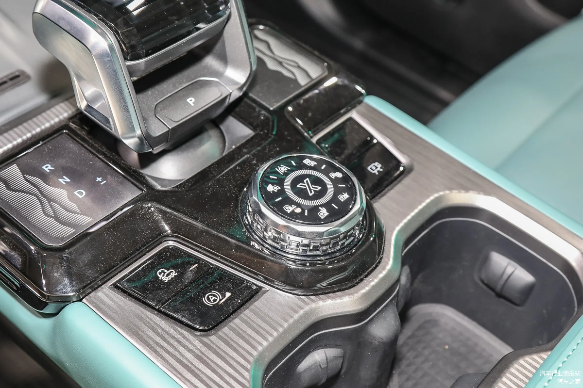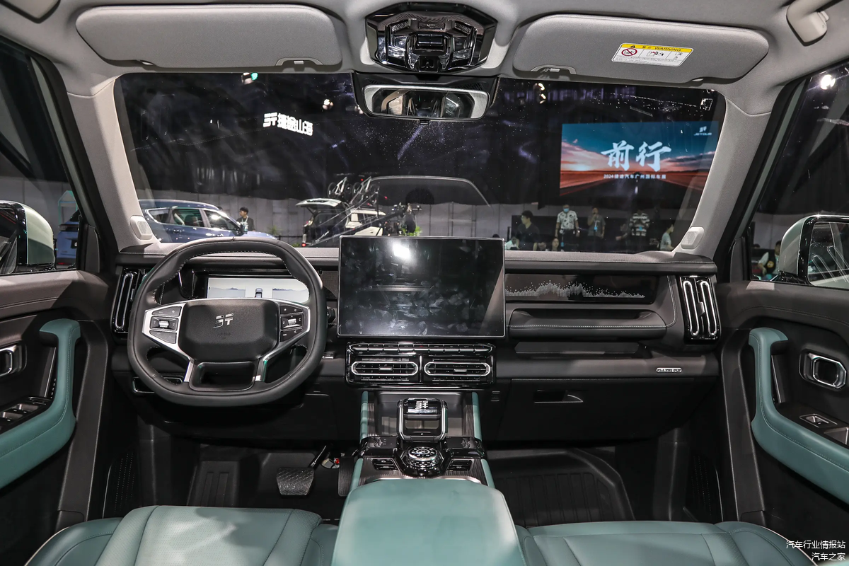 自由者的内饰布局打破传统越野车设计范式。15.6英寸悬浮中控屏与电子怀挡的组合,搭配8155芯片和华为生态,在智能交互方面相比坦克300的传统物理按键布局更显激进。而诸如HUD抬头显示、麂皮材质座椅、多色氛围灯等配置,明显在向城市年轻用户示好。