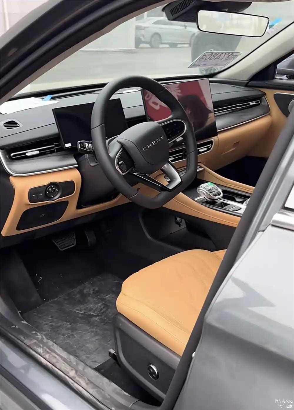 新款艾瑞泽8 Pro的内饰取消了双联屏设计,采用与风云A8L相同的环抱式座舱,配备15.6英寸悬浮式中控屏和10.25英寸矩形全液晶仪表盘,搭载高通骁龙8155智能座舱系统,科技感十足。三幅式方向盘上带有“CHERY”标识,副仪表台保留了现款艾瑞泽8的样式,配备一排物理按键、50W手机无线充电和电子挡把等。
