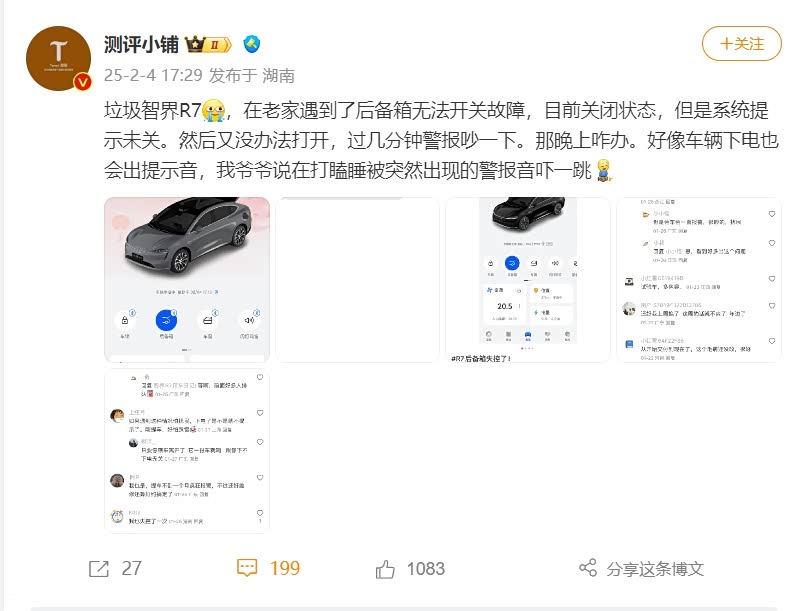 一位微博名为“测评小铺”的数码博主,通过微博描述了其亲身经历。他在老家遇到了智界R7后备箱故障,明明车辆后备箱已经关闭了,但系统却提示没有关闭。此外,车辆后备箱还没办法打开,过几分钟就报警响一下。车辆在下电后,依然会发出提示音,还惊吓到了他爷爷。