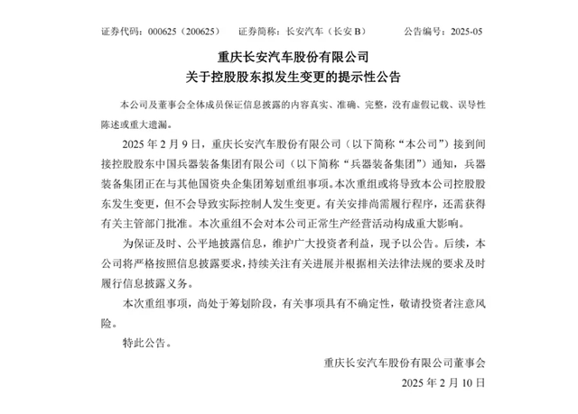 2月9日晚间,多家上市公司密集发布公告。中国兵装旗下的长安汽车、哈飞动力、建设工业等7家兵器装备集团旗下公司发布公告称,兵器装备集团正在与其他国资央企集团筹划重组事项。本次重组或将导致公司控股股东发生变更,但不会导致实际控制人发生变更。另一家央企东风汽车旗下的东风股份和东风科技也均发布了关于间接控股股东可能发生变更的公告。
