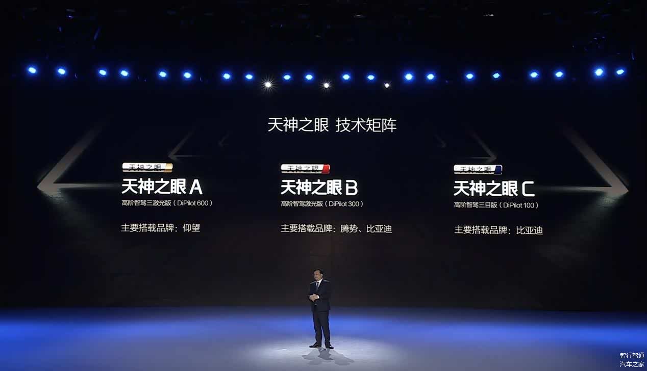 具体来说,这套智驾系统分为天神之眼A/B/C三套方案,对应的价格段从低到高,天神之眼A主要搭载在仰望品牌上,天神之眼B主要搭载在比亚迪和腾势品牌上,天神之眼C主要搭载在比亚迪品牌上。