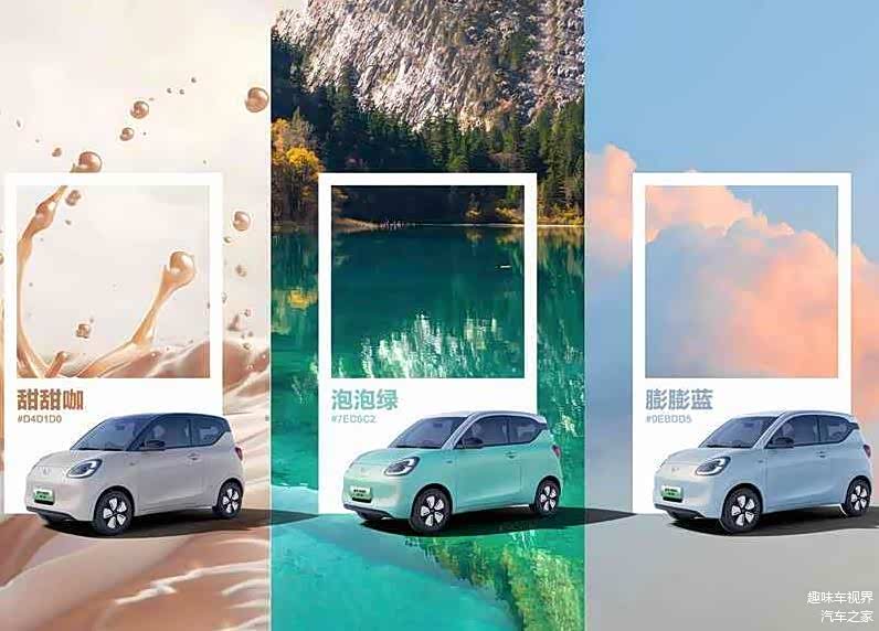 为了迎合不同消费者的审美,新车还对外观配色进行升级,提供膨膨蓝、泡泡绿、甜甜咖3款车身配色。而车身尺寸方面,全新五菱宏光MINIEV四门版的长宽高分别为3256/1510/1578毫米,轴距为2190毫米。相比现款两门车型在长度、宽度、轴距方面均有所增加,但高度降低36毫米。车身侧面,配备黑色外后视镜保护罩以及全新样式的13英寸轮辋;车尾部分,造型上更加的简洁,尾灯和前大灯相呼应,取消了现款车型连接尾灯的饰条,并且将“WULING”英文标识更换为品牌商标,可以说是将简洁贯彻到底。