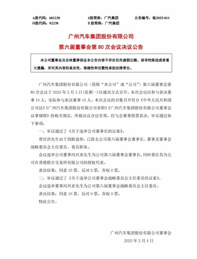 新华AUTO:新年尹始,广汽集团发布公告称:公司董事会收到曾庆洪送达的《辞职函》,曾庆洪到龄退休,将不再公司担任任何职务。公司第六届董事会第80次会议选举董事冯兴亚为公司第六届董事会董事长。