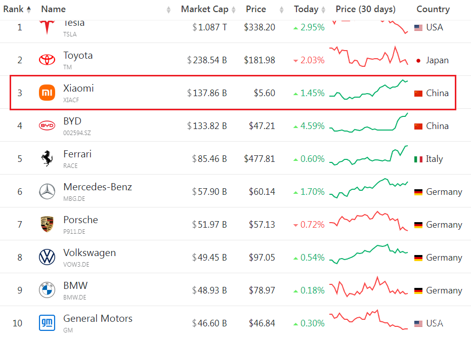 比亚迪也站上万亿市值,但还是没有小米高。事实上,从市值角度来看,小米已经反超比亚迪,成中国第一大车企。截止2月12日,最新的全球车企市值排行榜显示,美国特斯拉和日本本田牢牢垄断着冠亚军,地位十分稳固。而小米集团则紧随其后,攀升至第三名,市值高达1378亿美元。同时,比亚迪为1338亿美元,排名第四。至于上汽、长城、吉利等,分别为291亿美元、251亿美元、229亿美元,与小米相差甚远。