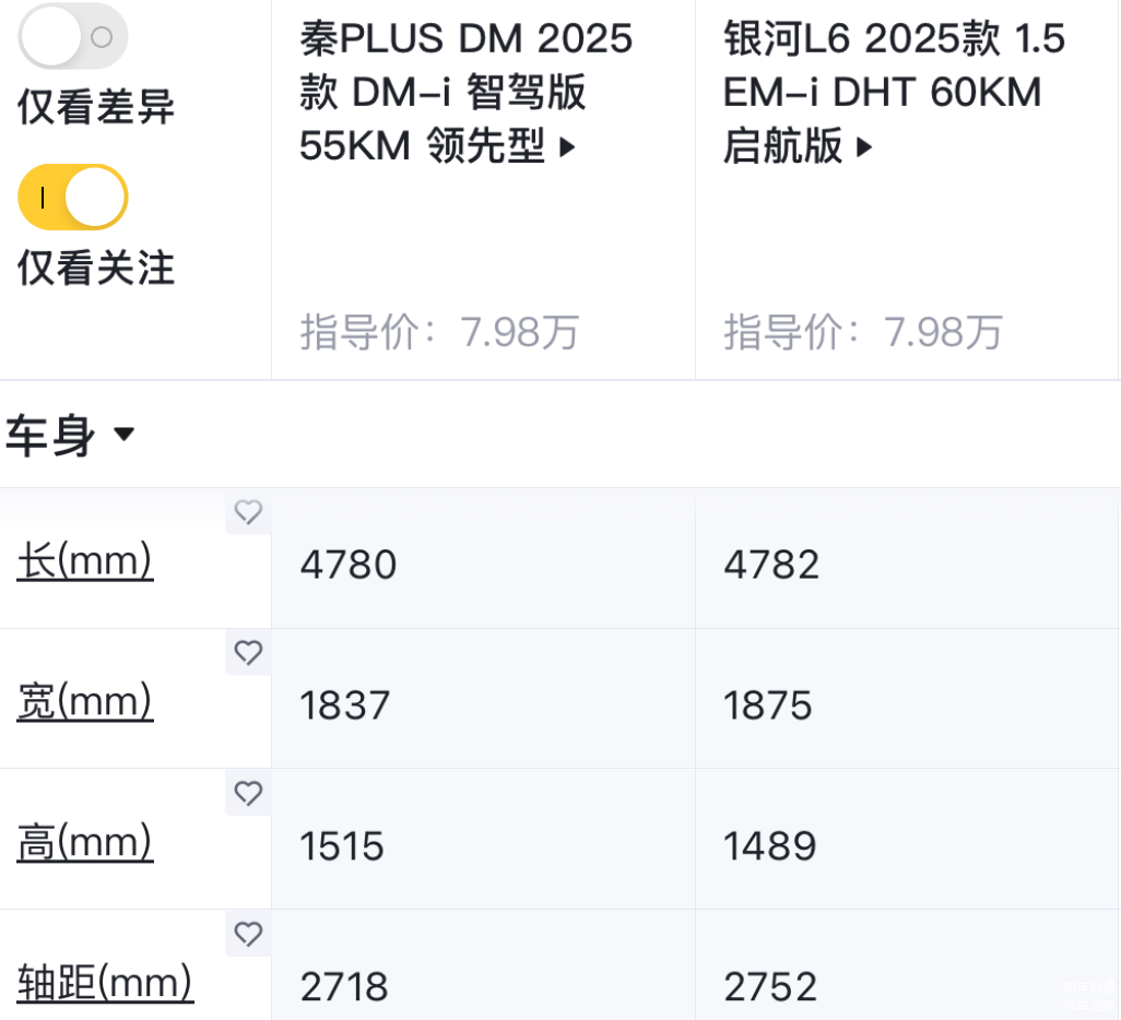 车身尺寸方面,银河L6的长宽高分别为4782/1875/1489mm,轴距为2752mm;秦PLUS DM-i的长宽高分别为4780/1837/1515mm,轴距为2718mm。