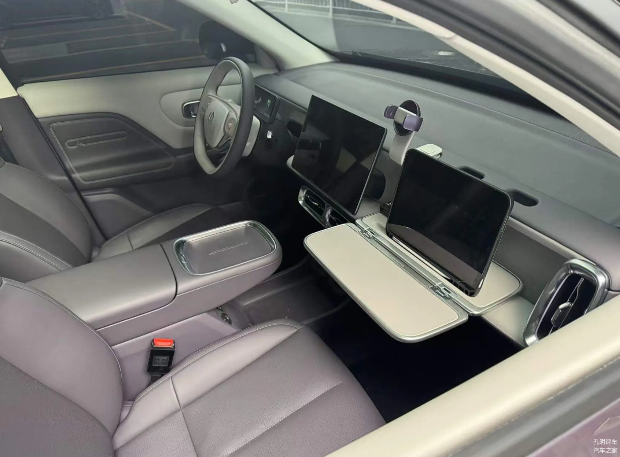比较有意思的是全新内饰设计,这次真的是思路打开了,整个中控台面看起来很规整,乍一看好像没什么特别之处,还是采用了数字液晶仪表盘以及大尺寸中控车机屏幕。但是请注意副驾驶一侧有明显的魔术空间,自带了6个拓展位置,除了可以加装副驾驶的娱乐屏幕,甚至可以装上比较大的折叠桌板,后续可能还会推出更多样化的套件,这样整体的可玩性就比较丰富了。