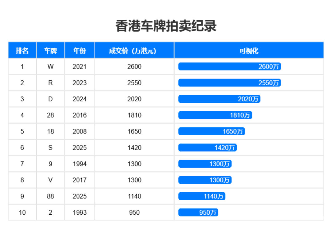 根据香港车牌历年拍卖纪录,无字头“W”:2021年以2,600万港元成交。无字头“R”:2023年以2,550万港元成交。无字头“D”:2024年以2,020万港元成交。无字头“28”:2016年以1,810万港元成交。无字头“18”:2008年以1,650万港元成交。无字头“9”:1994年以1,300万港元成交。无字头“V”:2017年以1,300万港元成交。无字头“S”:2025年以1,420万港元成交。无字头“88”:2025年以1,140万港元成交。无字头“2”:1993年以950万港元成交。
