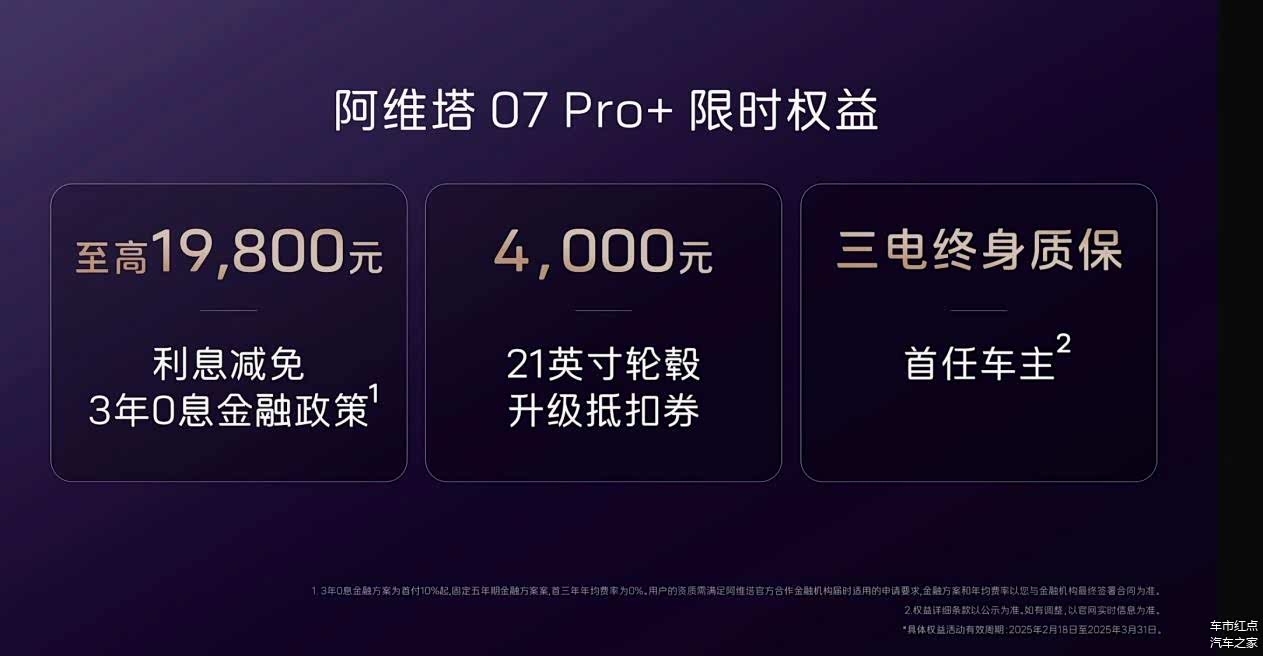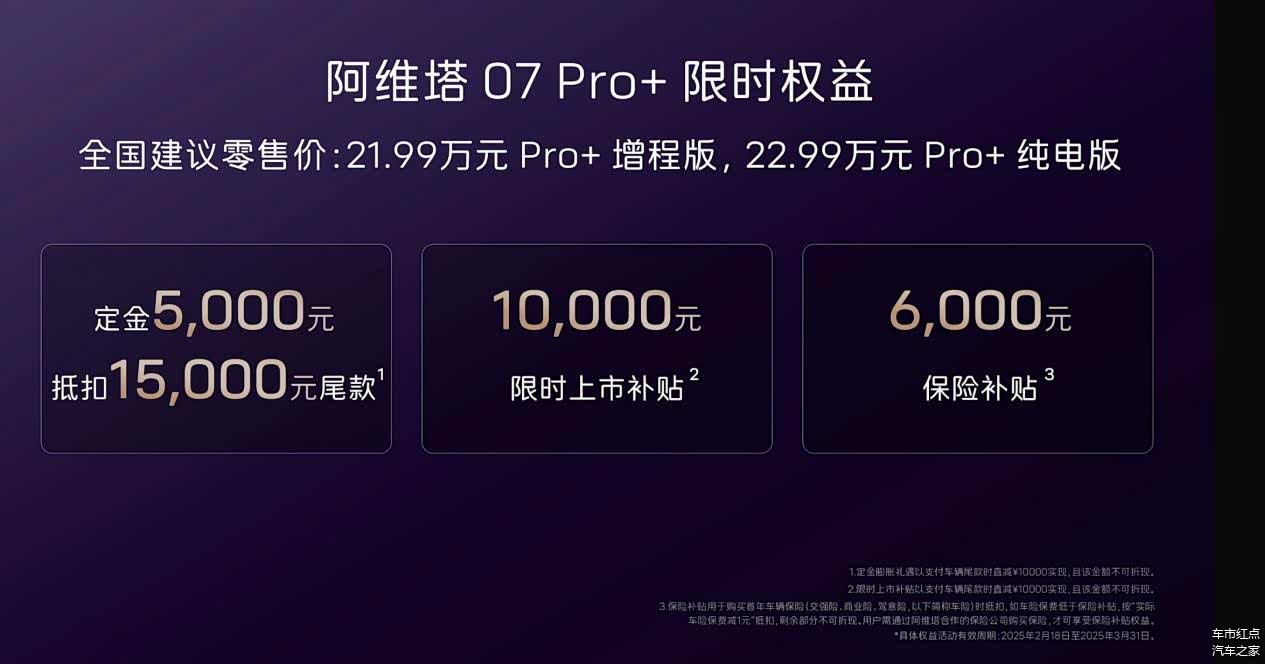 在高端豪华车市场,阿维塔率先打响科技平权和高端平权战。2月18日, 阿维塔07(图片 | 参数 | 询价) Pro+正式迎来上市,其中增程版本售价21.99万元,纯电版本售价22.99万元。新车权益方面,新车将提供5000元抵扣1.5万元尾款、限时1万元上市补贴,以及6000元保险补贴、三年免息等权益。