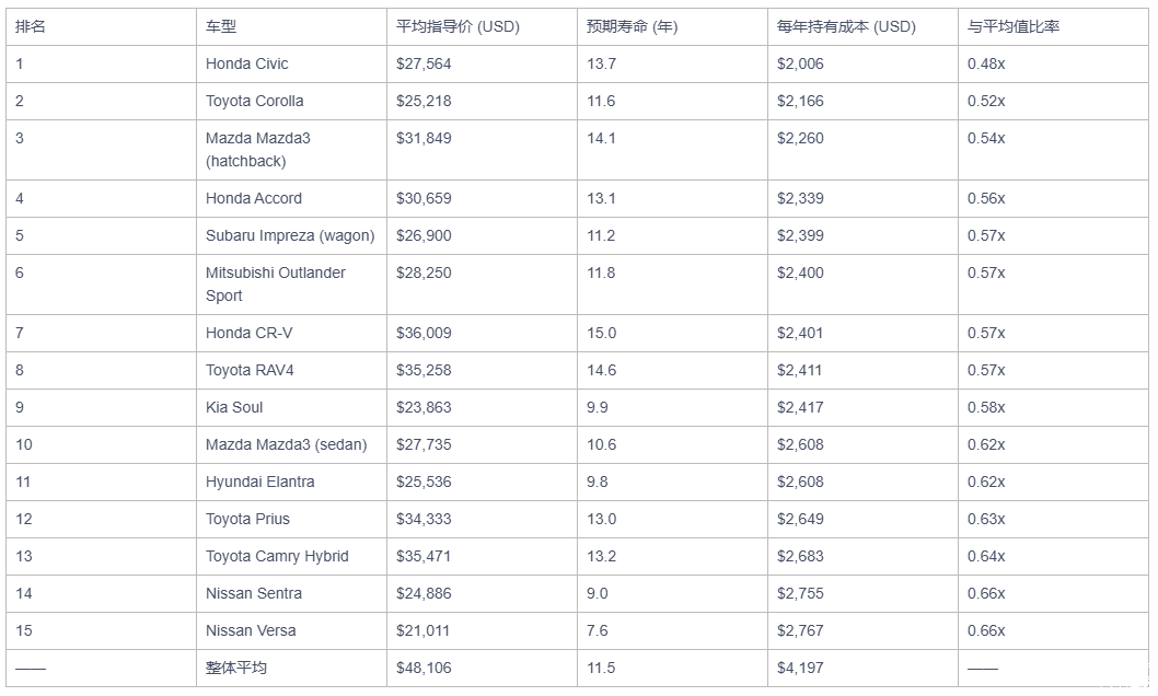 iSeeCars的研究方法是将每款车型的平均新车价格与其预期寿命相除,得出“每年持有成本”(单位为美元/年),进而进行车型排名。虽然该方法未考虑后续的保养和维修费用,而且长保修政策可能使某些品牌的实际拥有成本更低,但依然能从中看出哪些车型在长期使用中的经济性更突出。