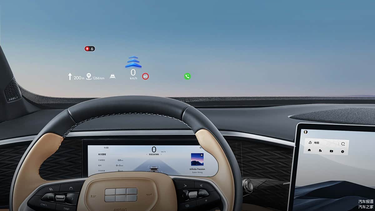 内饰部分,黑棕双拼的配色和环抱式大屏设计,营造出舒适且科技感十足的驾乘环境。丰富的智能配置,让驾驶变得更加便捷和有趣。此外,无线充电面板以及 AR-HUD 抬头显示、四辐式多功能方向盘、电子怀挡、可开启全景天窗等配置的加持,进一步提升了整车的豪华感与实用性。