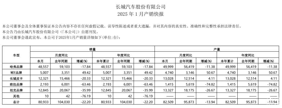 最近,长城汽车官方发布了最新一期的产销快报,1月,长城汽车销售8万辆,同比下跌22.2%,而新能源车销量为22263辆,同比减少了11.05%。