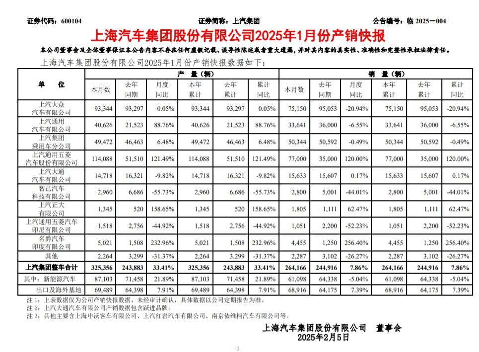 2025年1月上汽集团整体销量达26.42万辆,同比增长7.86%。不过,上汽大众、上汽通用、上汽乘用车的销量均在下滑。其中,上汽乘用车1月销量50344辆,智己汽车2800辆,名爵汽车印度公司4455辆。